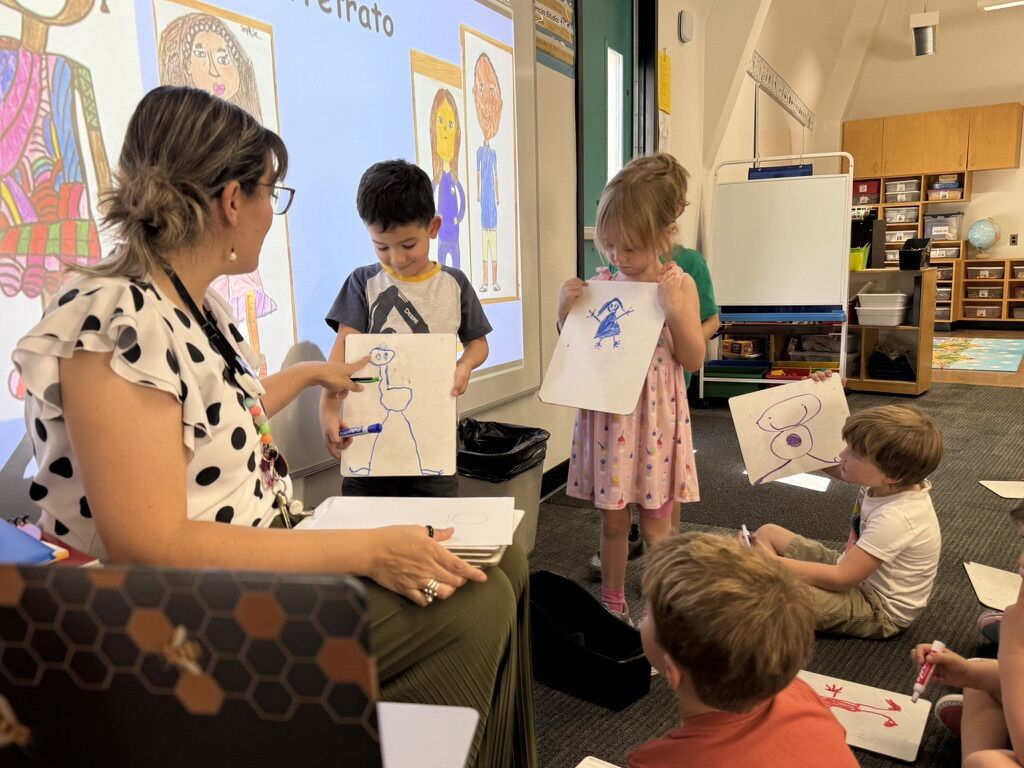 Ventana Vista kindergartners proudly show off their self-portraits during a Spanish immersion lesson.